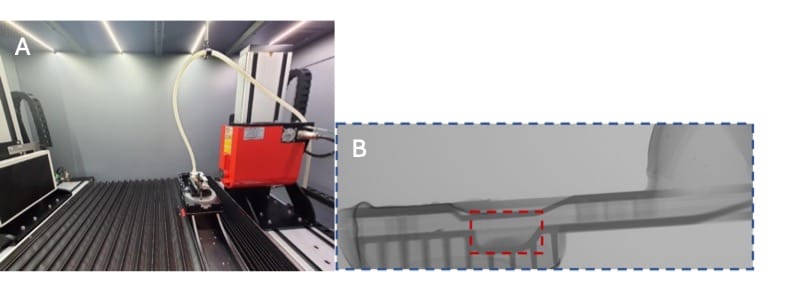 Figure 1. (A) Set up at the Rx scanner at the 4D Imaging Lab, LU, and (B) resulting radiograph, with the entire FOV (58 mm in width) in blue, and the selected region of interest for the final experiment at ESRF.